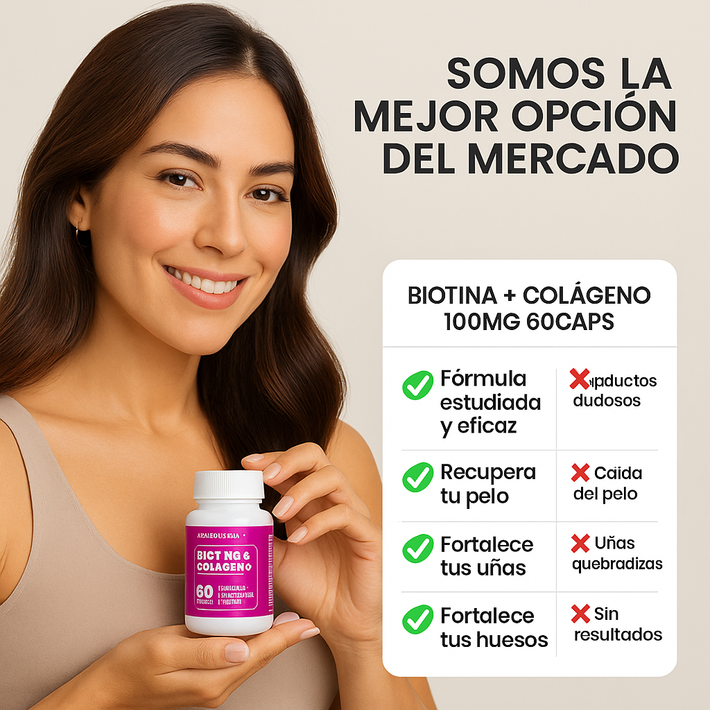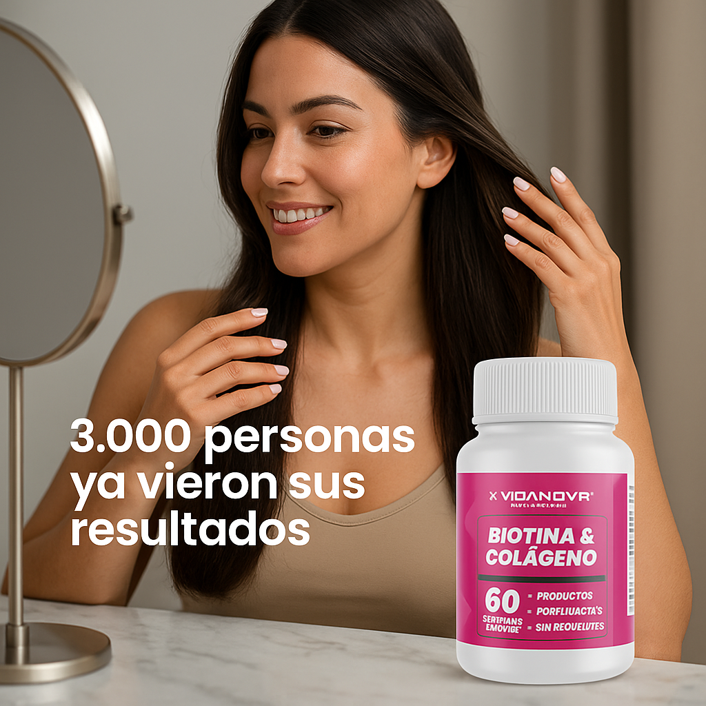 Biotina apoya la síntesis de queratina en folículo, uñas y piel. Colágeno hidrolizado entrega aminoácidos clave para estructura y firmeza. Vitaminas antioxidantes (A-C-E) protegen frente al estrés oxidativo; D y Complejo B contribuyen a funciones metabólicas y de crecimiento.