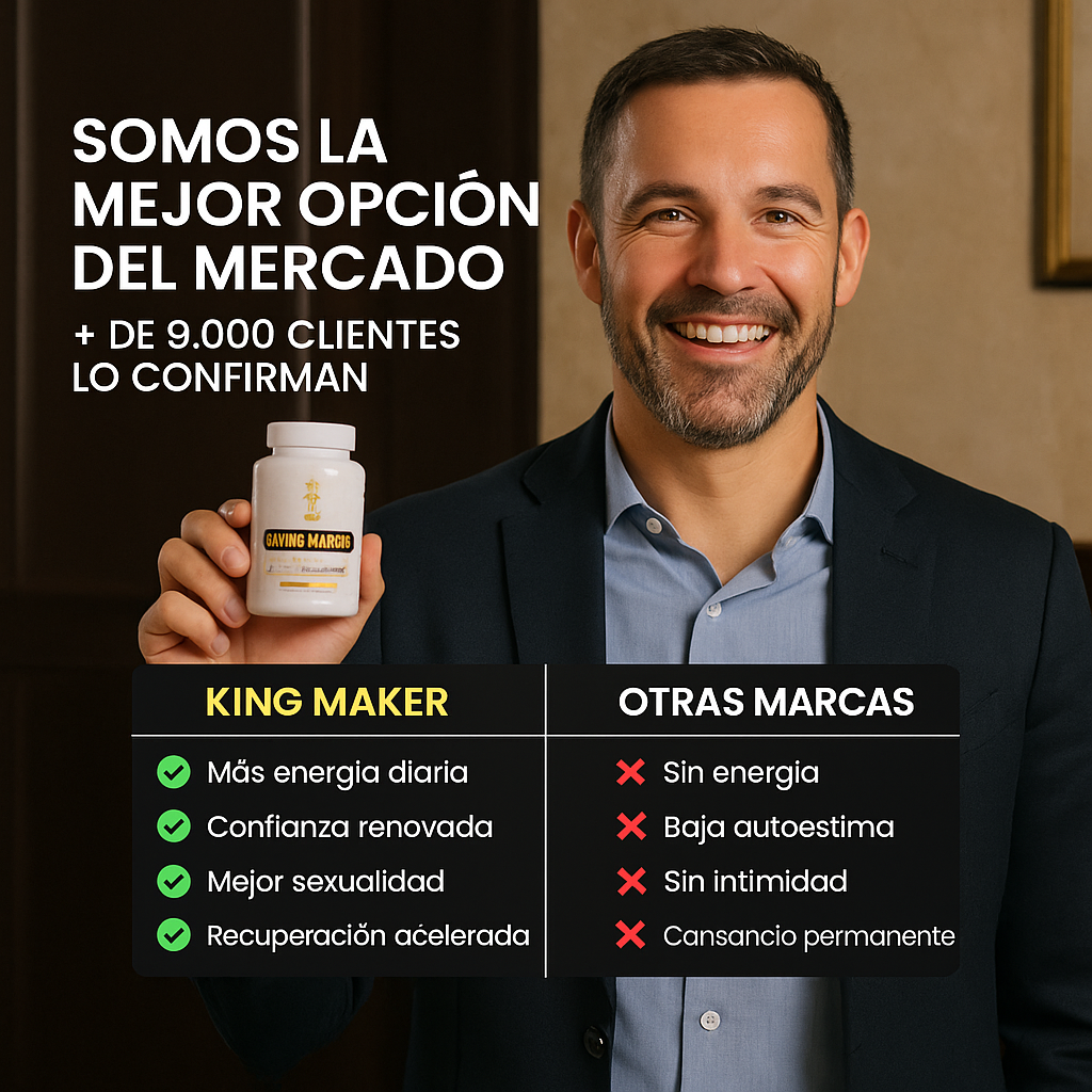 ⚡ King Maker™ es el suplemento masculino 13-en-1 diseñado para potenciar tu vitalidad física y mental. Con ingredientes naturales de alta eficacia, este stack único apoya tu rendimiento en el entrenamiento, en el trabajo y en tu vida diaria.
